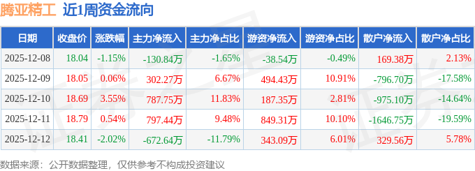 资金流向数据方面,本周腾亚精工主力资金合计净流入1083.98万元,游资资金合计净流入1835.64万元,散户资金合计净流出2919.62万元。本周资金流向一览见下表: