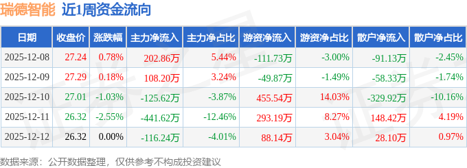 资金流向数据方面,本周瑞德智能主力资金合计净流出372.42万元,游资资金合计净流入675.27万元,散户资金合计净流出302.85万元。本周资金流向一览见下表:
