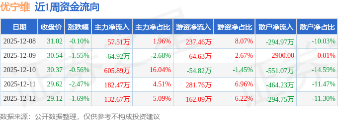 资金流向数据方面,本周优宁维主力资金合计净流入913.62万元,游资资金合计净流入691.13万元,散户资金合计净流出1604.74万元。本周资金流向一览见下表: