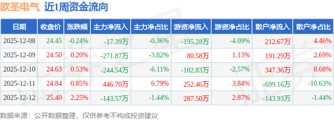 资金流向数据方面,本周欧圣电气主力资金合计净流出230.67万元,游资资金合计净流入322.43万元,散户资金合计净流出91.76万元。本周资金流向一览见下表: