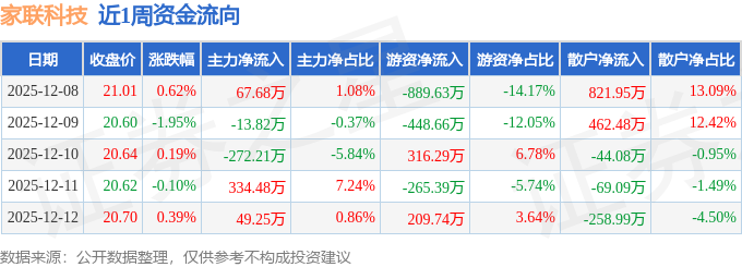 资金流向数据方面,本周家联科技主力资金合计净流入165.37万元,游资资金合计净流出1077.64万元,散户资金合计净流入912.27万元。本周资金流向一览见下表: