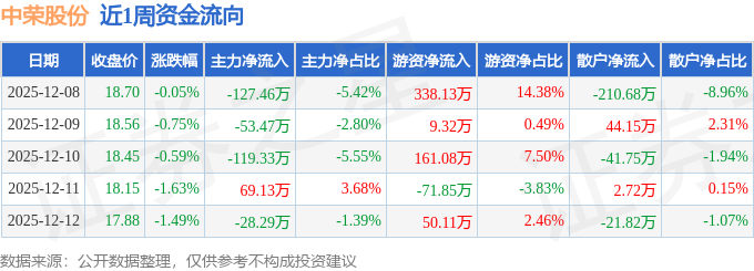 资金流向数据方面,本周中荣股份主力资金合计净流出259.41万元,游资资金合计净流入486.79万元,散户资金合计净流出227.38万元。本周资金流向一览见下表: