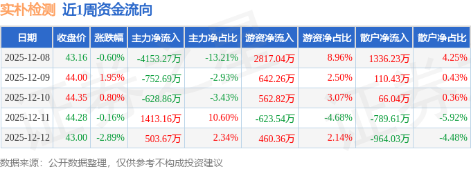 资金流向数据方面,本周实朴检测主力资金合计净流出3617.99万元,游资资金合计净流入3858.94万元,散户资金合计净流出240.94万元。本周资金流向一览见下表: