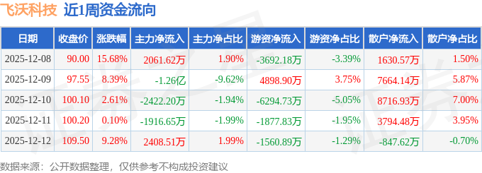 资金流向数据方面,本周飞沃科技主力资金合计净流出1.24亿元,游资资金合计净流出8526.74万元,散户资金合计净流入2.1亿元。本周资金流向一览见下表: