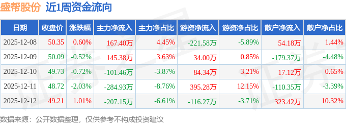 资金流向数据方面,本周盛帮股份主力资金合计净流出280.78万元,游资资金合计净流入175.77万元,散户资金合计净流入105.0万元。本周资金流向一览见下表: