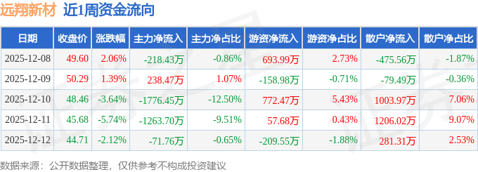 资金流向数据方面,本周远翔新材主力资金合计净流出3091.86万元,游资资金合计净流入1155.61万元,散户资金合计净流入1936.25万元。本周资金流向一览见下表: