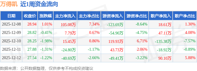 资金流向数据方面,本周万得凯主力资金合计净流入62.83万元,游资资金合计净流出64.34万元,散户资金合计净流入1.51万元。本周资金流向一览见下表: