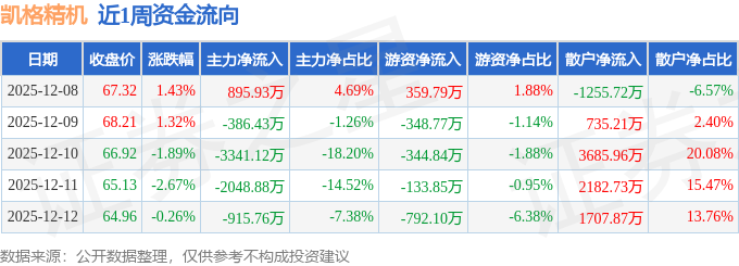 资金流向数据方面,本周凯格精机主力资金合计净流出5796.25万元,游资资金合计净流出1259.78万元,散户资金合计净流入7056.03万元。本周资金流向一览见下表: