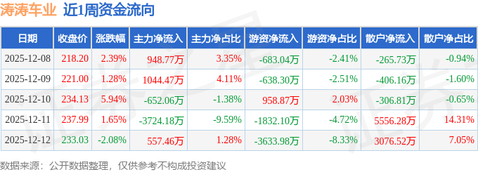 资金流向数据方面,本周涛涛车业主力资金合计净流出1825.54万元,游资资金合计净流出5828.56万元,散户资金合计净流入7654.1万元。本周资金流向一览见下表:
