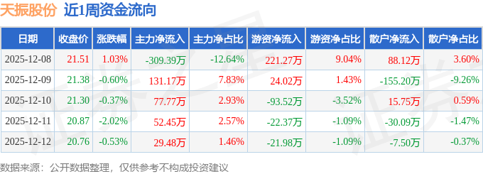 资金流向数据方面,本周天振股份主力资金合计净流出18.51万元,游资资金合计净流入107.43万元,散户资金合计净流出88.92万元。本周资金流向一览见下表: