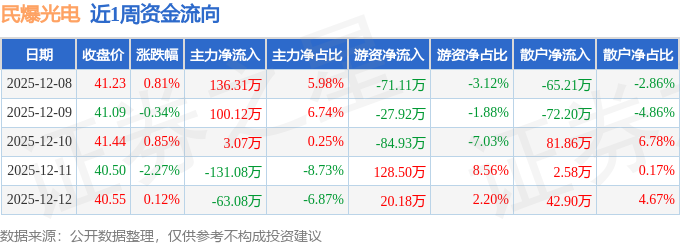 资金流向数据方面,本周民爆光电主力资金合计净流入45.34万元,游资资金合计净流出35.27万元,散户资金合计净流出10.07万元。本周资金流向一览见下表: