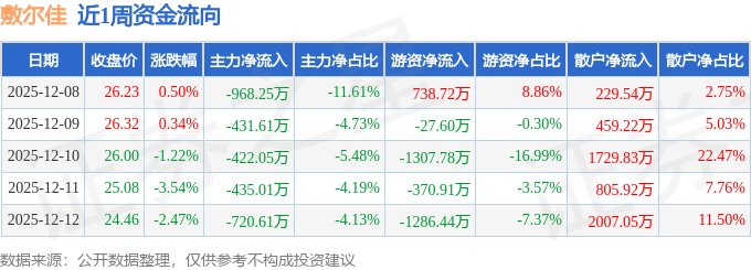 资金流向数据方面,本周敷尔佳主力资金合计净流出2977.55万元,游资资金合计净流出2254.01万元,散户资金合计净流入5231.55万元。本周资金流向一览见下表: