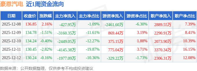 资金流向数据方面,本周豪恩汽电主力资金合计净流出1.22亿元,游资资金合计净流出771.2万元,散户资金合计净流入1.29亿元。本周资金流向一览见下表: