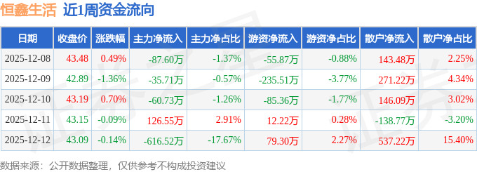 资金流向数据方面,本周恒鑫生活主力资金合计净流出674.0万元,游资资金合计净流出285.23万元,散户资金合计净流入959.23万元。本周资金流向一览见下表: