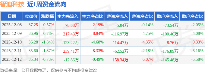 资金流向数据方面,本周智迪科技主力资金合计净流入399.34万元,游资资金合计净流入88.27万元,散户资金合计净流出487.61万元。本周资金流向一览见下表:
