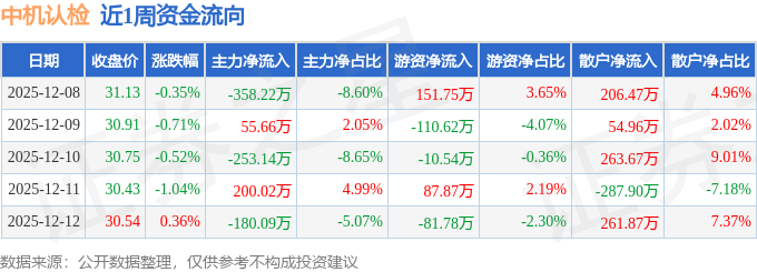 资金流向数据方面,本周中机认检主力资金合计净流出535.76万元,游资资金合计净流入36.69万元,散户资金合计净流入499.08万元。本周资金流向一览见下表:
