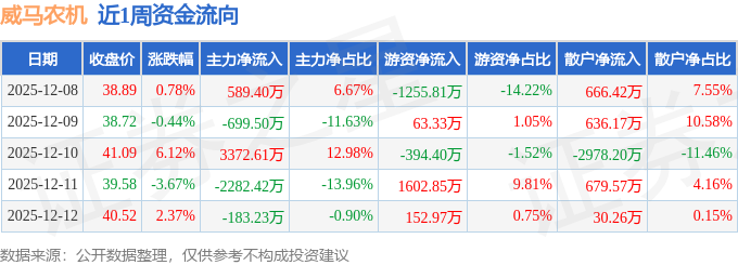 资金流向数据方面,本周威马农机主力资金合计净流入796.85万元,游资资金合计净流入168.93万元,散户资金合计净流出965.79万元。本周资金流向一览见下表: