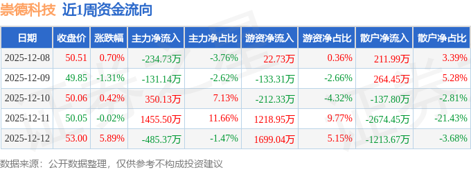 资金流向数据方面,本周崇德科技主力资金合计净流入954.4万元,游资资金合计净流入2595.08万元,散户资金合计净流出3549.47万元。本周资金流向一览见下表: