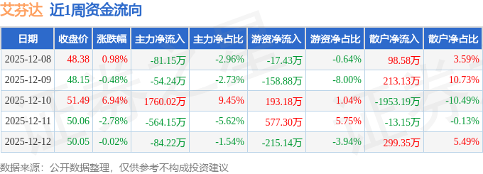 资金流向数据方面,本周艾芬达主力资金合计净流入976.25万元,游资资金合计净流入379.03万元,散户资金合计净流出1355.28万元。本周资金流向一览见下表: