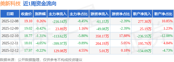 资金流向数据方面,本周美新科技主力资金合计净流出576.76万元,游资资金合计净流入449.13万元,散户资金合计净流入127.63万元。本周资金流向一览见下表: