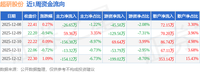 资金流向数据方面,本周超研股份主力资金合计净流出291.11万元,游资资金合计净流出358.23万元,散户资金合计净流入649.34万元。本周资金流向一览见下表: