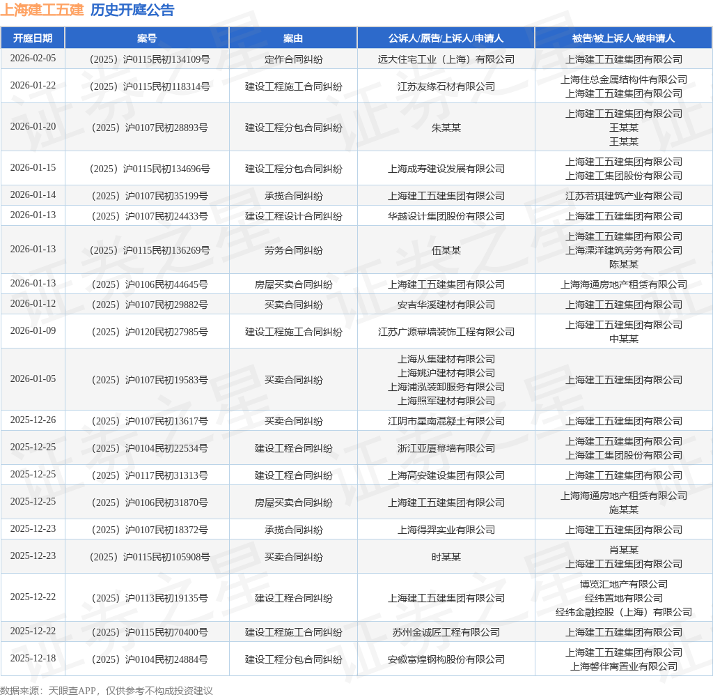 案号:(2025)沪0114民初31228号根据统计,近一年内以上海建工五建集团有限公司为当事人的历史开庭公告有301则,其中案由为“建设工程分包合同纠纷”的公告以58则居首,其次为“建设工程施工合同纠纷”有54则,“买卖合同纠纷”有37则。历史开庭公告(前20条)如下: