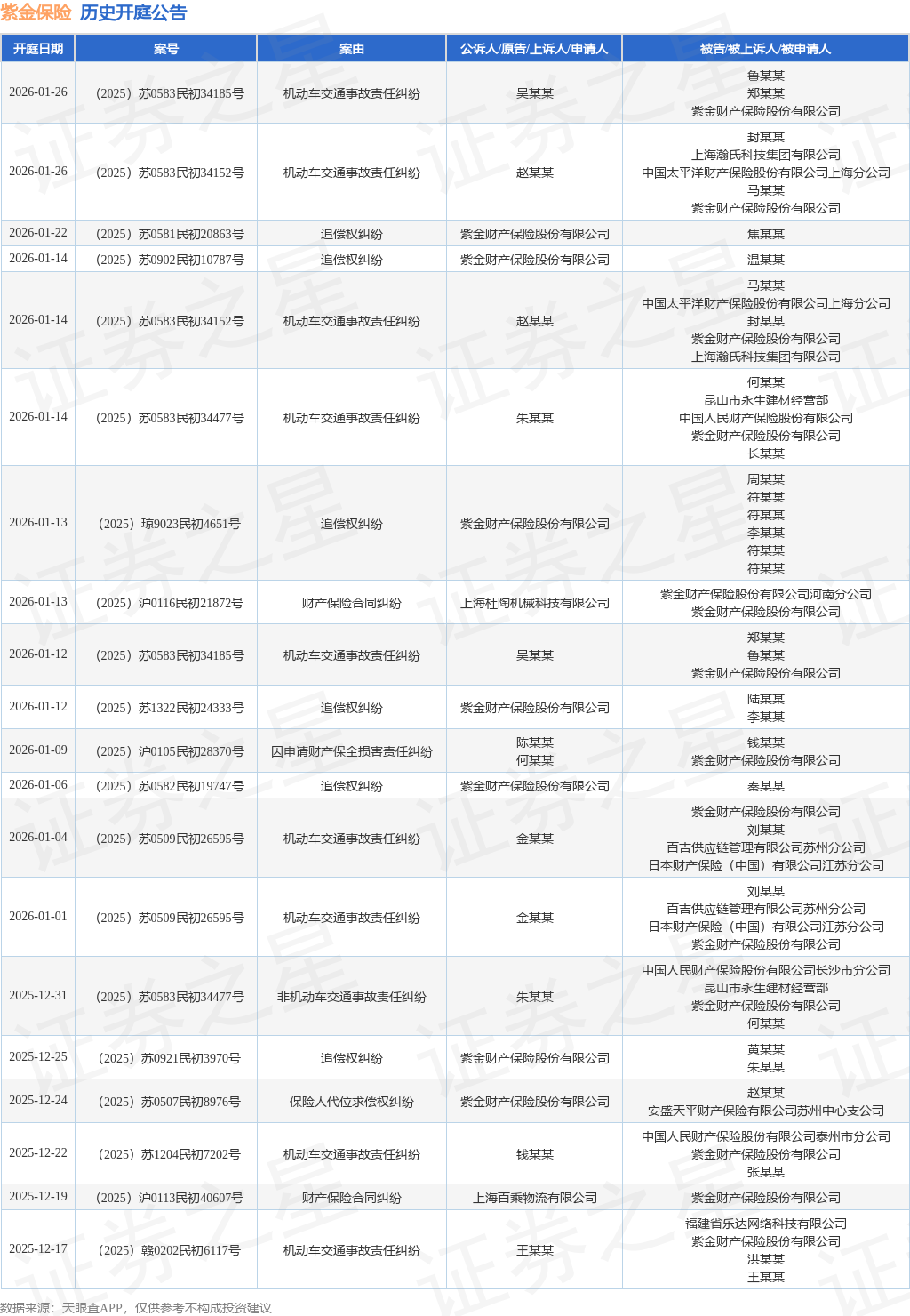 案号:(2025)赣0202民初6117号根据统计,近一年内以紫金财产保险股份有限公司为当事人的历史开庭公告有807则,其中案由为“追偿权纠纷”的公告以310则居首,其次为“机动车交通事故责任纠纷”有302则,“保险人代位求偿权纠纷”有71则。历史开庭公告(前20条)如下: