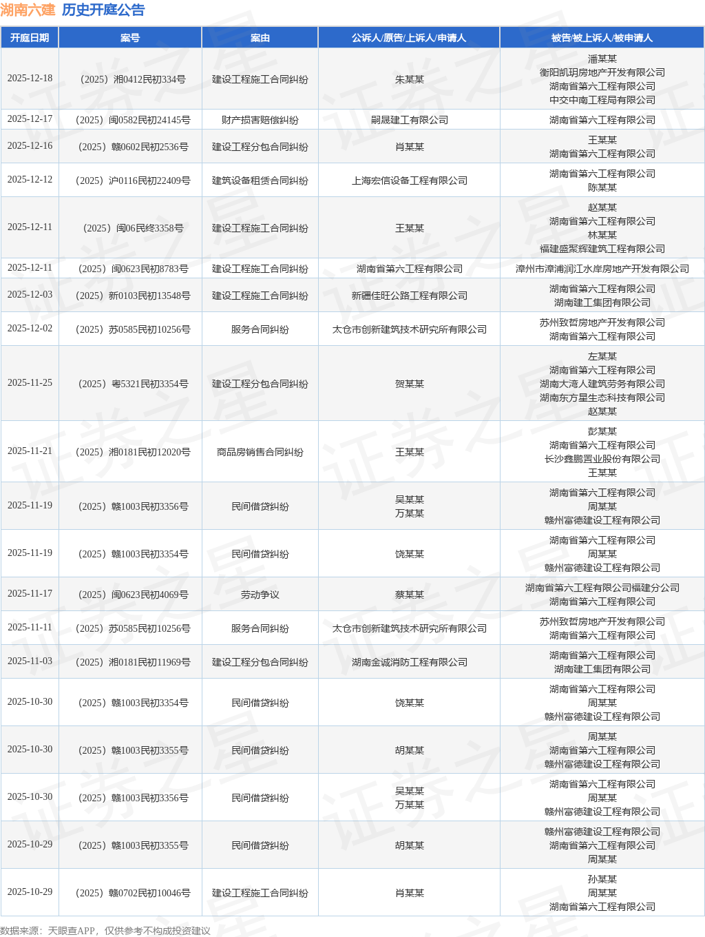 案号:(2025)闽0582民初24145号根据统计,近一年内以湖南省第六工程有限公司为当事人的历史开庭公告有214则,其中案由为“建设工程施工合同纠纷”的公告以59则居首,其次为“建设工程分包合同纠纷”有32则,“买卖合同纠纷”有18则。历史开庭公告(前20条)如下:
