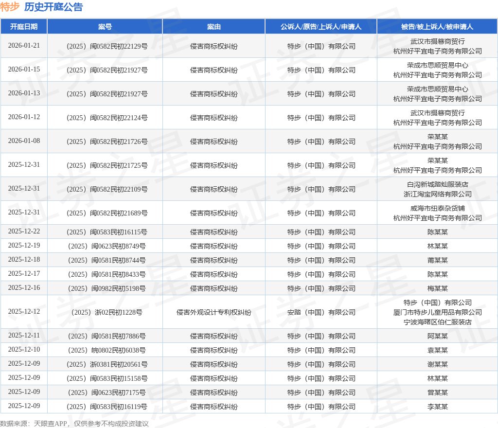 案号:(2025)闽0581民初8433号根据统计,近一年内以特步(中国)有限公司为当事人的历史开庭公告有279则,其中案由为“侵害商标权纠纷”的公告以222则居首,其次为“侵害外观设计专利权纠纷”有21则,“侵害商标权”有18则。历史开庭公告(前20条)如下: