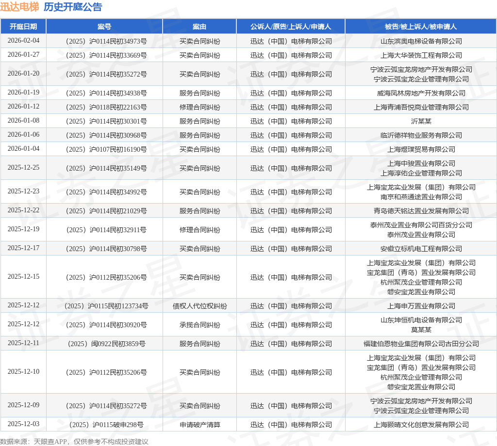 案号:(2025)沪0114民初30798号根据统计,近一年内以迅达(中国)电梯有限公司为当事人的历史开庭公告有230则,其中案由为“买卖合同纠纷”的公告以143则居首,其次为“承揽合同纠纷”有30则,“修理合同纠纷”有16则。历史开庭公告(前20条)如下: