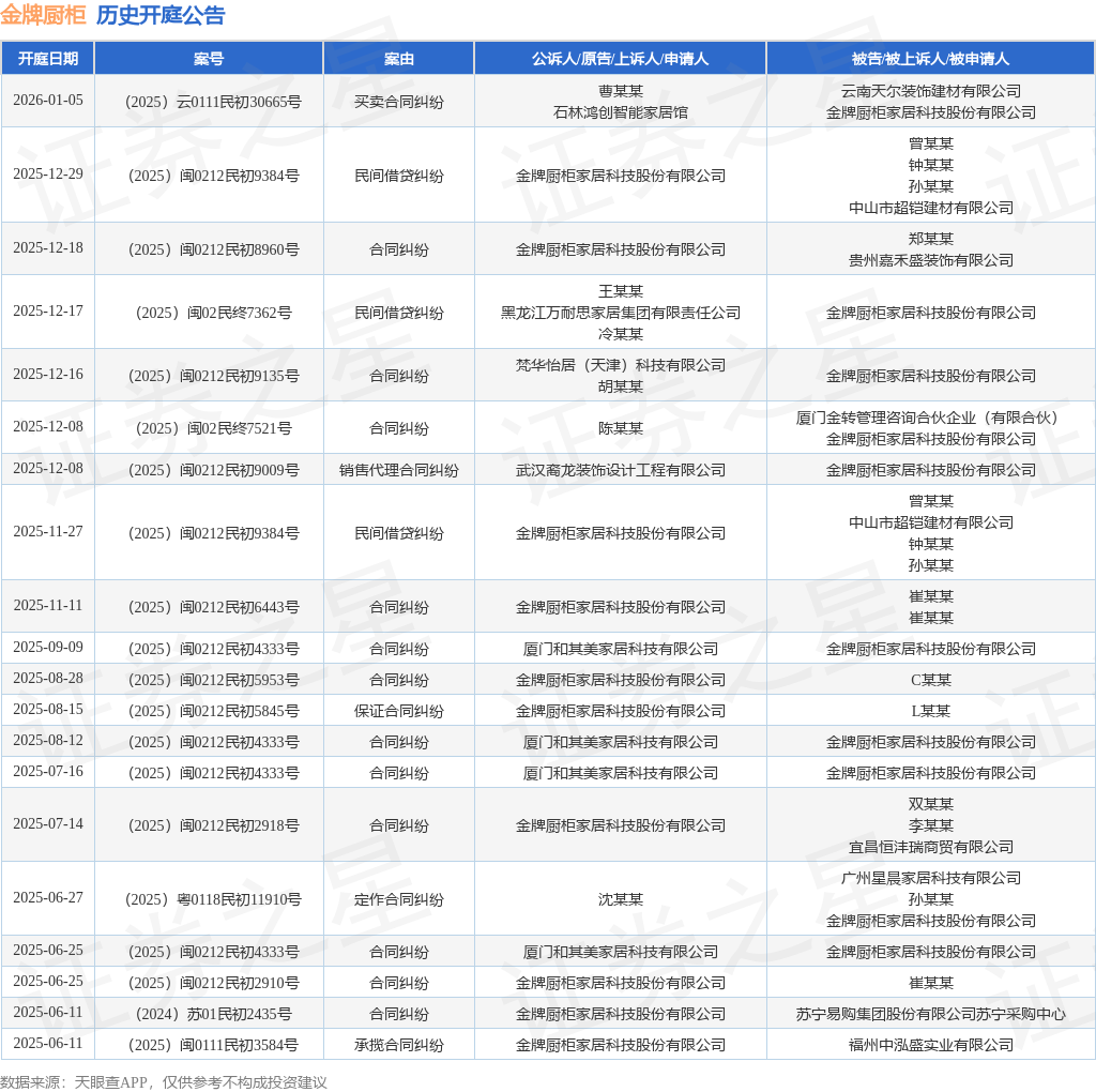 案号:(2025)闽02民终7362号根据统计,近一年内以金牌厨柜家居科技股份有限公司为当事人的历史开庭公告有29则,其中案由为“合同纠纷”的公告以15则居首,其次为“定作合同纠纷”有4则,“民间借贷纠纷”有3则。历史开庭公告(前20条)如下: