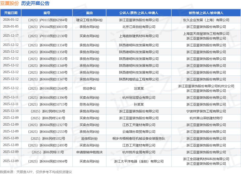 案号:(2025)沪0110民初12130号根据统计,近一年内以浙江亚厦装饰股份有限公司为当事人的历史开庭公告有591则,其中案由为“买卖合同纠纷”的公告以213则居首,其次为“劳务合同纠纷”有111则,“建设工程施工合同纠纷”有57则。历史开庭公告(前20条)如下: