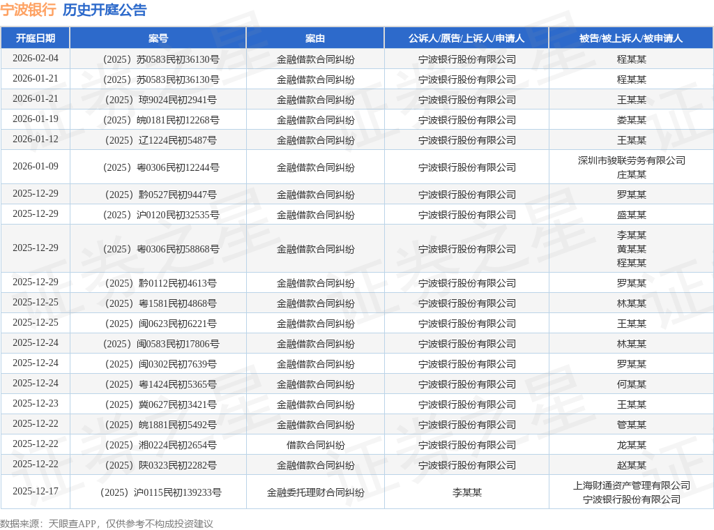 案号:(2025)沪0115民初139233号根据统计,近一年内以宁波银行股份有限公司为当事人的历史开庭公告有1580则,其中案由为“金融借款合同纠纷”的公告以1394则居首,其次为“借款”有115则,“借款合同纠纷”有36则。历史开庭公告(前20条)如下: