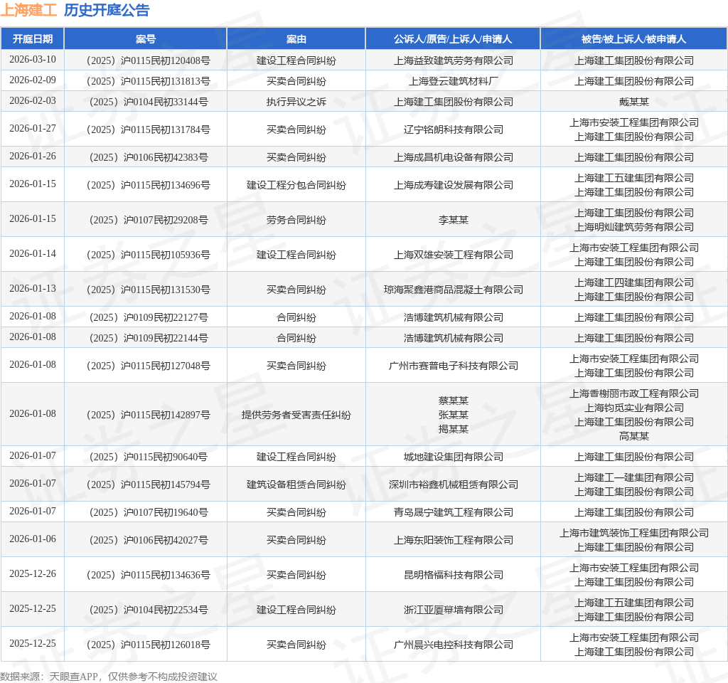 案号:(2025)沪0106民初37474号根据统计,近一年内以上海建工集团股份有限公司为当事人的历史开庭公告有450则,其中案由为“买卖合同纠纷”的公告以117则居首,其次为“建设工程施工合同纠纷”有87则,“建设工程分包合同纠纷”有42则。历史开庭公告(前20条)如下: