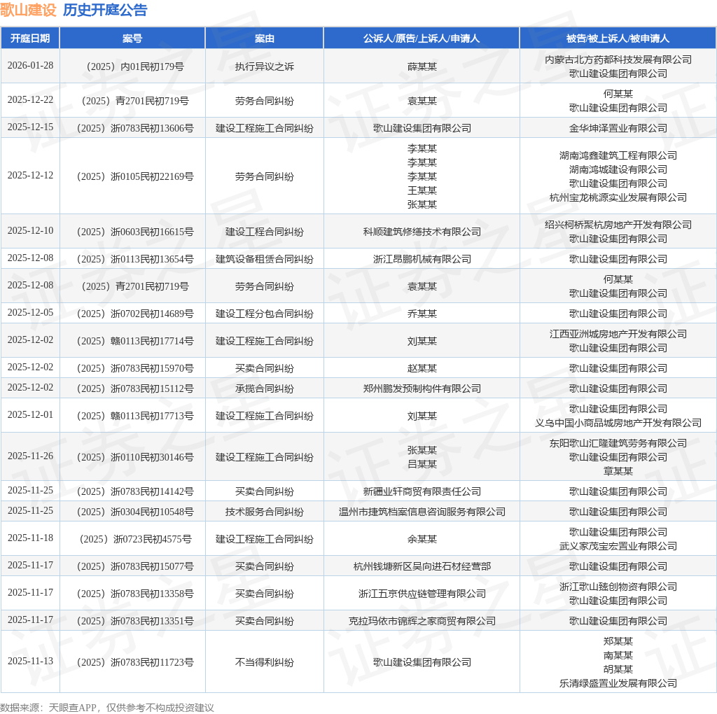 案号:(2025)浙0783民初13606号根据统计,近一年内以歌山建设集团有限公司为当事人的历史开庭公告有243则,其中案由为“买卖合同纠纷”的公告以63则居首,其次为“建设工程施工合同纠纷”有51则,“建筑设备租赁合同纠纷”有29则。历史开庭公告(前20条)如下: