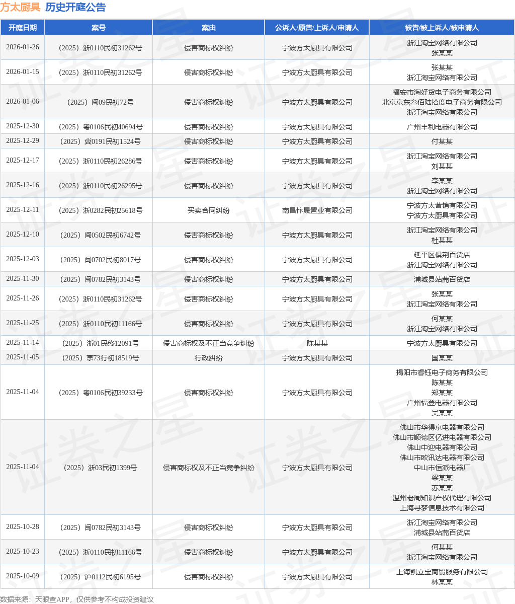 案号:(2025)浙0110民初26286号根据统计,近一年内以宁波方太厨具有限公司为当事人的历史开庭公告有101则,其中案由为“侵害商标权纠纷”的公告以75则居首,其次为“侵害商标权”有4则,“侵害商标权及不正当竞争纠纷”有4则。历史开庭公告(前20条)如下: