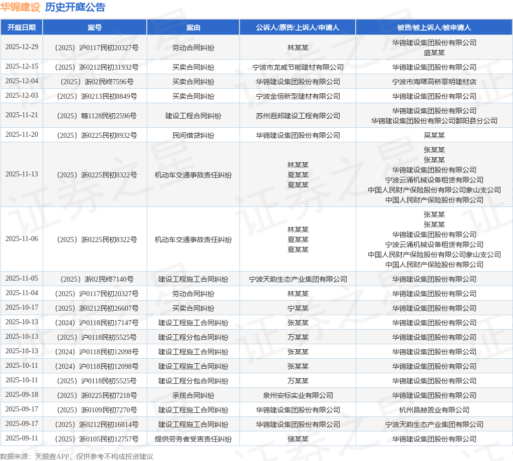 案号:(2025)浙0212民初31932号根据统计,近一年内以华锦建设集团股份有限公司为当事人的历史开庭公告有105则,其中案由为“买卖合同纠纷”的公告以30则居首,其次为“建设工程施工合同纠纷”有28则,“建设工程分包合同纠纷”有8则。历史开庭公告(前20条)如下: