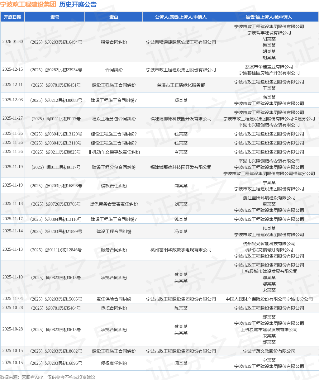 案号:(2025)浙0282民初23934号根据统计,近一年内以宁波市政工程建设集团股份有限公司为当事人的历史开庭公告有91则,其中案由为“建设工程施工合同纠纷”的公告以13则居首,其次为“建设工程分包合同纠纷”有11则,“建设工程合同纠纷”有6则。历史开庭公告(前20条)如下: