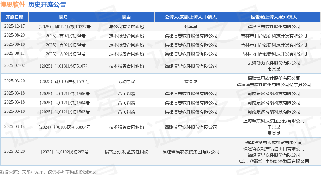 案号:(2025)闽0121民初10337号根据统计,近一年内以福建博思软件股份有限公司为当事人的历史开庭公告有11则,其中案由为“技术服务合同纠纷”的公告以5则居首,其次为“合同纠纷”有3则,“与公司有关的纠纷”有1则。历史开庭公告如下: