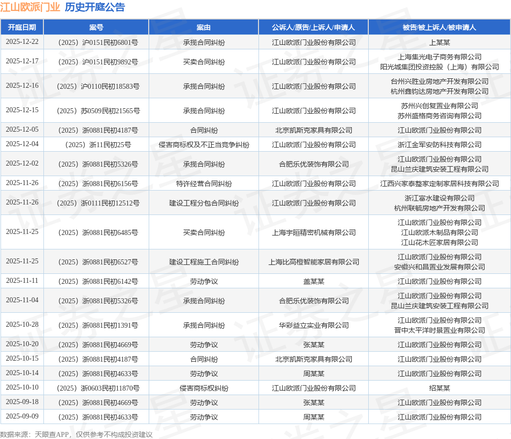 案号:(2025)沪0151民初9892号根据统计,近一年内以江山欧派门业股份有限公司为当事人的历史开庭公告有102则,其中案由为“承揽合同纠纷”的公告以34则居首,其次为“买卖合同纠纷”有21则,“劳动争议”有11则。历史开庭公告(前20条)如下:
