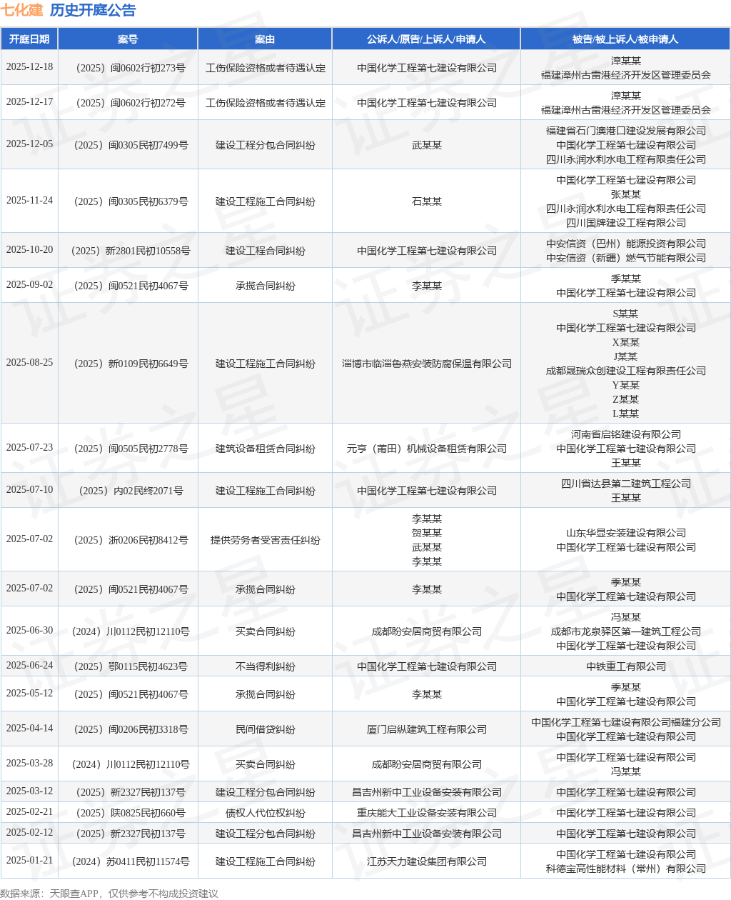 案号:(2025)闽0602行初272号根据统计,近一年内以中国化学工程第七建设有限公司为当事人的历史开庭公告有27则,其中案由为“建设工程施工合同纠纷”的公告以6则居首,其次为“买卖合同纠纷”有5则,“建设工程分包合同纠纷”有4则。历史开庭公告(前20条)如下: