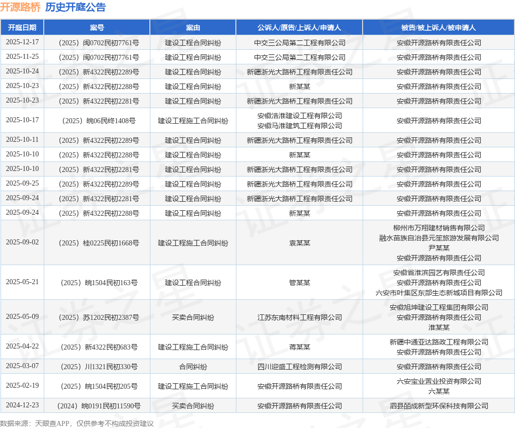 案号:(2025)闽0702民初7761号根据统计,近一年内以安徽开源路桥有限责任公司为当事人的历史开庭公告有19则,其中案由为“建设工程合同纠纷”的公告以12则居首,其次为“建设工程施工合同纠纷”有4则,“买卖合同纠纷”有2则。历史开庭公告如下: