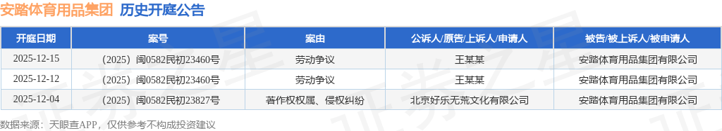 根据统计,近一年内以安踏体育用品集团有限公司为当事人的历史开庭公告有3则,其中案由为“劳动争议”的公告以2则居首,其次为“著作权权属、侵权纠纷”有1则。历史开庭公告如下: