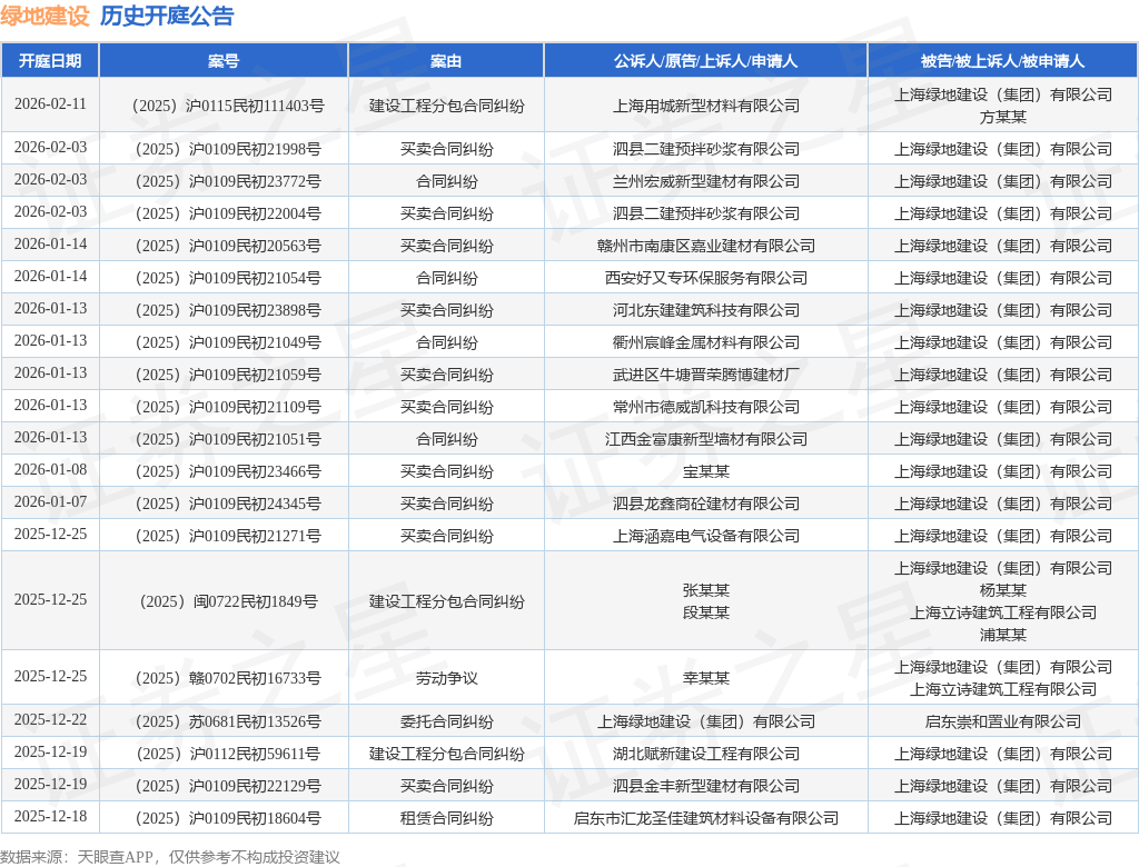 案号:(2025)沪0109民初14223号根据统计,近一年内以上海绿地建设(集团)有限公司为当事人的历史开庭公告有287则,其中案由为“买卖合同纠纷”的公告以73则居首,其次为“建设工程施工合同纠纷”有49则,“建设工程分包合同纠纷”有37则。历史开庭公告(前20条)如下: