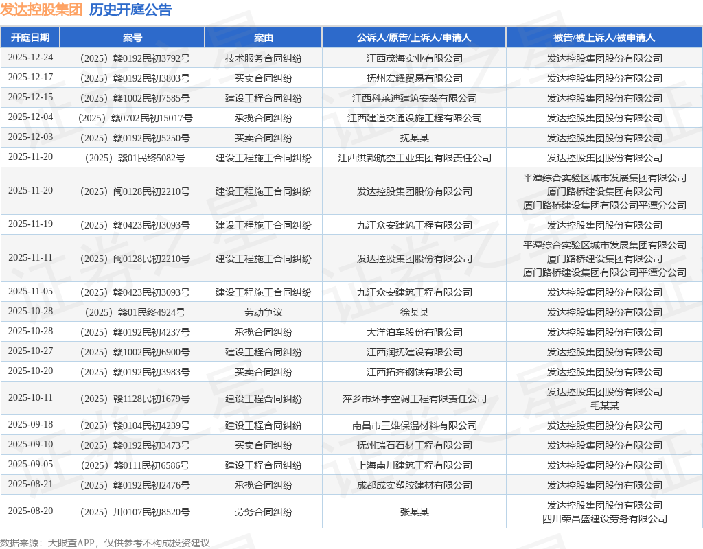 案号:(2025)赣0192民初3803号根据统计,近一年内以发达控股集团股份有限公司为当事人的历史开庭公告有59则,其中案由为“买卖合同纠纷”的公告以19则居首,其次为“建设工程施工合同纠纷”有9则,“建设工程合同纠纷”有8则。历史开庭公告(前20条)如下: