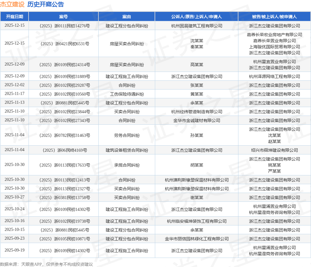 案号:(2025)浙0111民初14276号根据统计,近一年内以浙江杰立建设集团有限公司为当事人的历史开庭公告有80则,其中案由为“建设工程施工合同纠纷”的公告以16则居首,其次为“买卖合同纠纷”有15则,“劳务合同纠纷”有7则。历史开庭公告(前20条)如下: