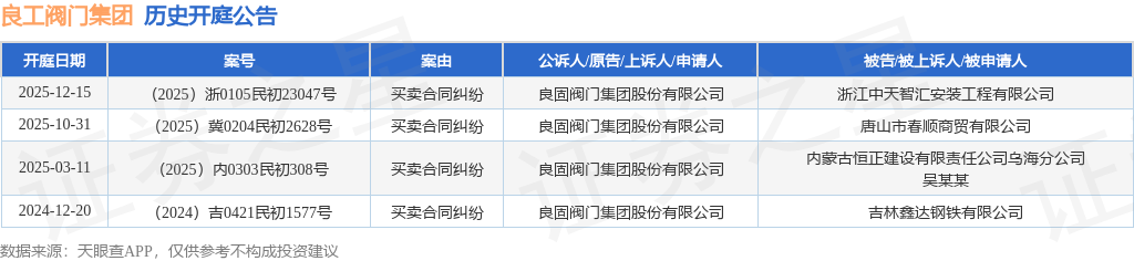 根据统计,近一年内以良固阀门集团股份有限公司为当事人的历史开庭公告有4则,其中案由为“买卖合同纠纷”的公告以4则居首。历史开庭公告如下: