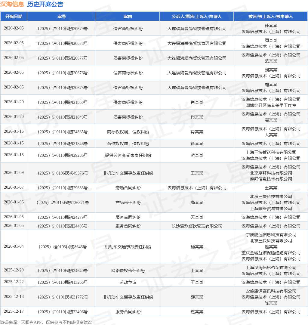 案号:(2025)沪0110民初22406号根据统计,近一年内以汉海信息技术(上海)有限公司为当事人的历史开庭公告有176则,其中案由为“劳动合同纠纷”的公告以49则居首,其次为“网络侵权责任纠纷”有28则,“非机动车交通事故责任纠纷”有16则。历史开庭公告(前20条)如下: