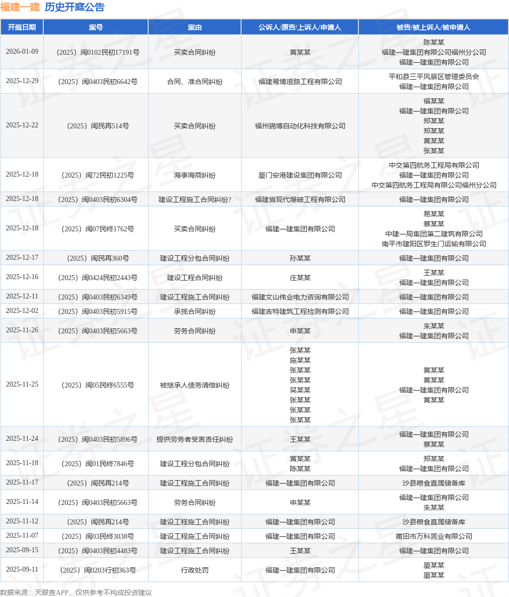 证券之星消息,根据天眼查APP显示,近日公布了一则福建一建集团有限公司作为被告/被上诉人的开庭公告,详细内容如下:
