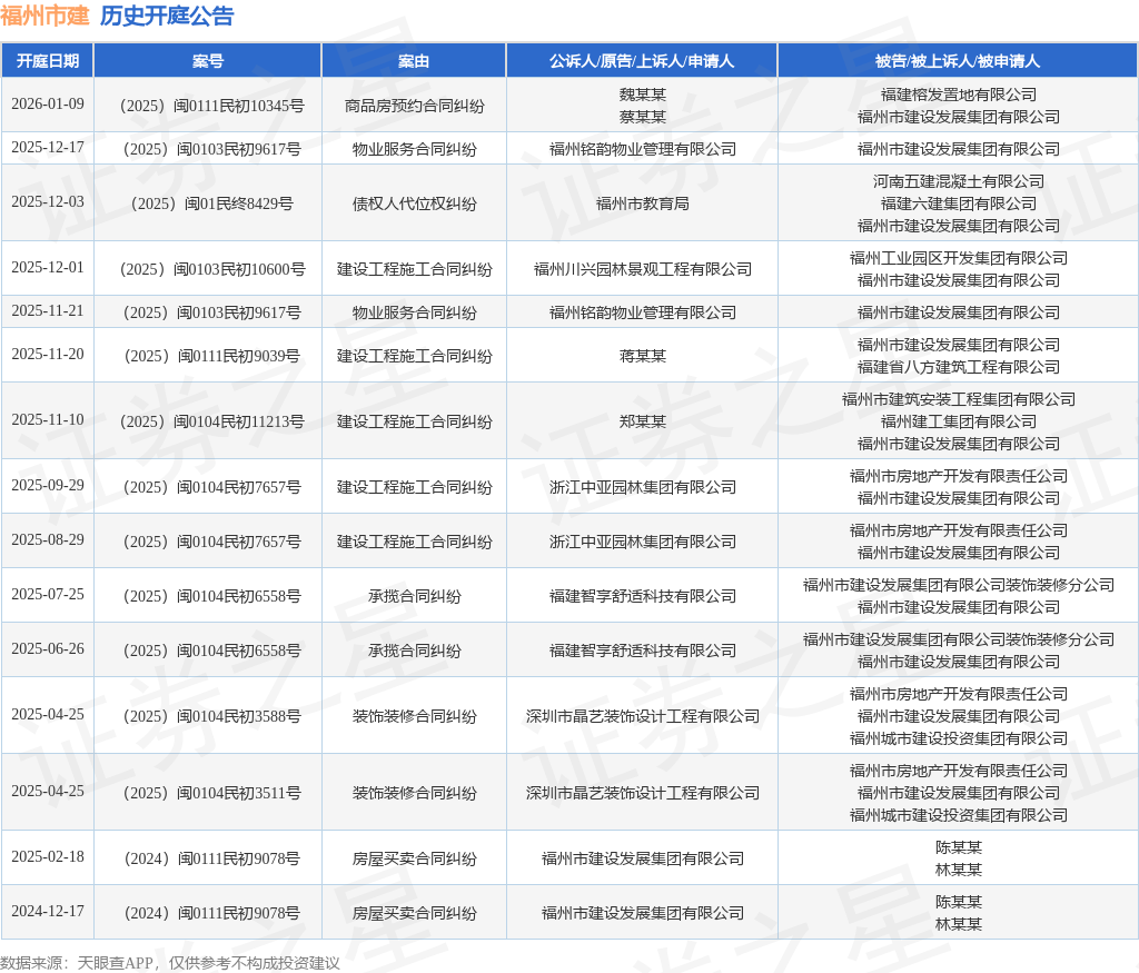 案号:(2025)闽0103民初9617号根据统计,近一年内以福州市建设发展集团有限公司为当事人的历史开庭公告有15则,其中案由为“建设工程施工合同纠纷”的公告以5则居首,其次为“房屋买卖合同纠纷”有2则,“承揽合同纠纷”有2则。历史开庭公告如下: